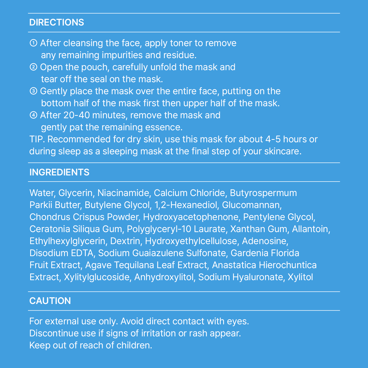 [FULL INGREDIENTS]Water, Glycerin, Niacinamide, Chondrus Crispus Powder, Glucomannan, Dextrin, Calcium Chloride, Butyrospermum Parkii Butter, 1,2-Hexanediol, Butylene Glycol, Hydroxyacetophenone, Ceratonia Siliqua Gum, Dextrin, Pentylene Glycol, Polyglyceryl-10 Laurate, Xanthan Gum, Dextrin, Allantoin, Ethylhexylglycerin, Water, Butylene Glycol, Agave Tequilana Leaf Extract, Water, Butylene Glycol, Anastatica Hierochuntica Extract, Gardenia Florida Fruit Extract, Dextrin, Hydroxyethylcellulose, Adenosine, Disodium EDTA, Sodium Guaiazulene Sulfonate, Water, Sodium Hyaluronate, 1,2-Hexanediol, Xylitylglucoside, Anhydroxylitol, Xylitol, Water